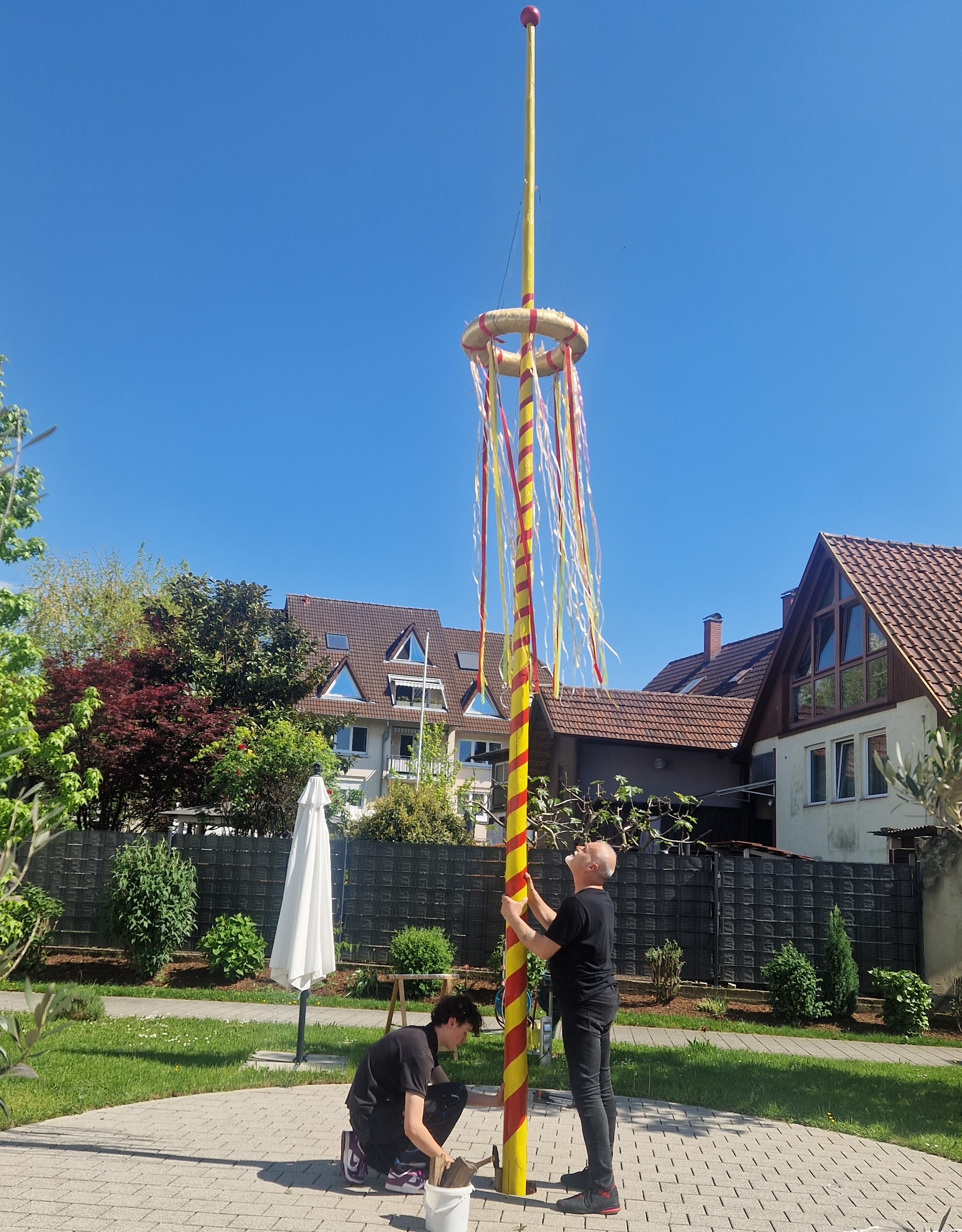 Bei herrlichem Frühlingswetter wurde auch in diesem Jahr wieder der Maibaum im Garten von unserer Haustechnik aufgestellt. Unsere Bewohnerinnen und Bewohner verfolgten das Geschehen mit wachem Blick und gespannter Erwartung und freuten sich sehr darüber.